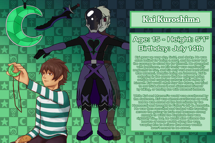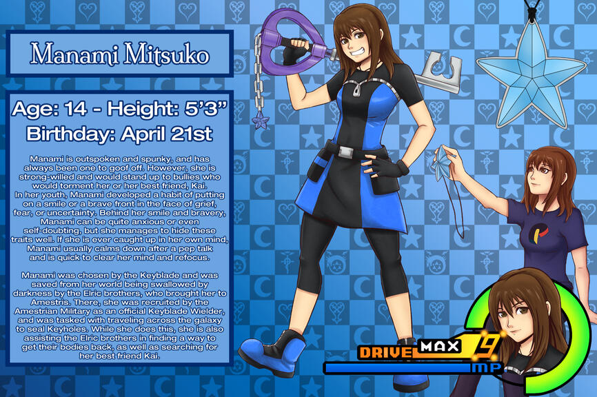 We started this project in 2007, and we managed to finish the story for what you would consider "Kingdom Hearts 1." Unfortunately, it's been lost to time, so as of 2019 we rebooted this story with new anime worlds and characters to include. This time, we're documenting everything so that it's safe.Where did Manami and Kai come from (in terms of creation)?